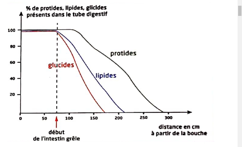 A l’aide d’une sonde qui passe par l’œsophage et travers l’estomac, on prélève un peu du contenu du tube digestif à différentes distances de la bouche chez un homme en cours de digestion . Ainsi, pour un repas de composition connue, on calcule les pourcentage de protides, lipides, glucides encore présents dans l’intestin à telle ou telle distance de la bouche.