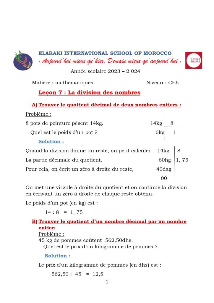 Leçon 7 : la division des nombres entiers et décimaux