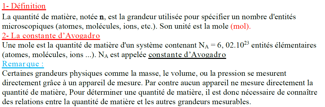 LES GRANDEURS PHYSIQUES LIEES A LA QUANTITE DE MATIERE.