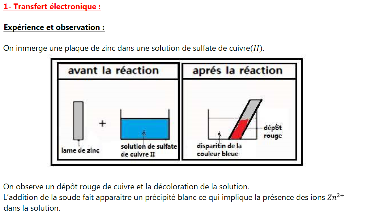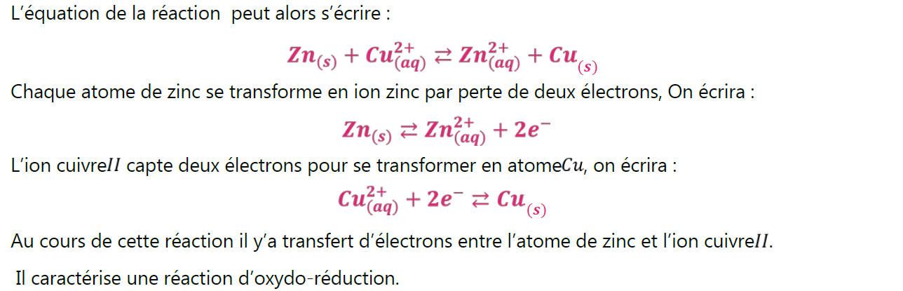 Au cours de cette réaction il y’a transfert d’électrons entre l’atome de zinc et l’ion cuivrelI.