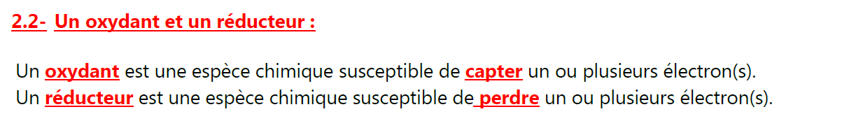 Un oxydant est une espèce chimique susceptible de capter un ou plusieurs électron(s).