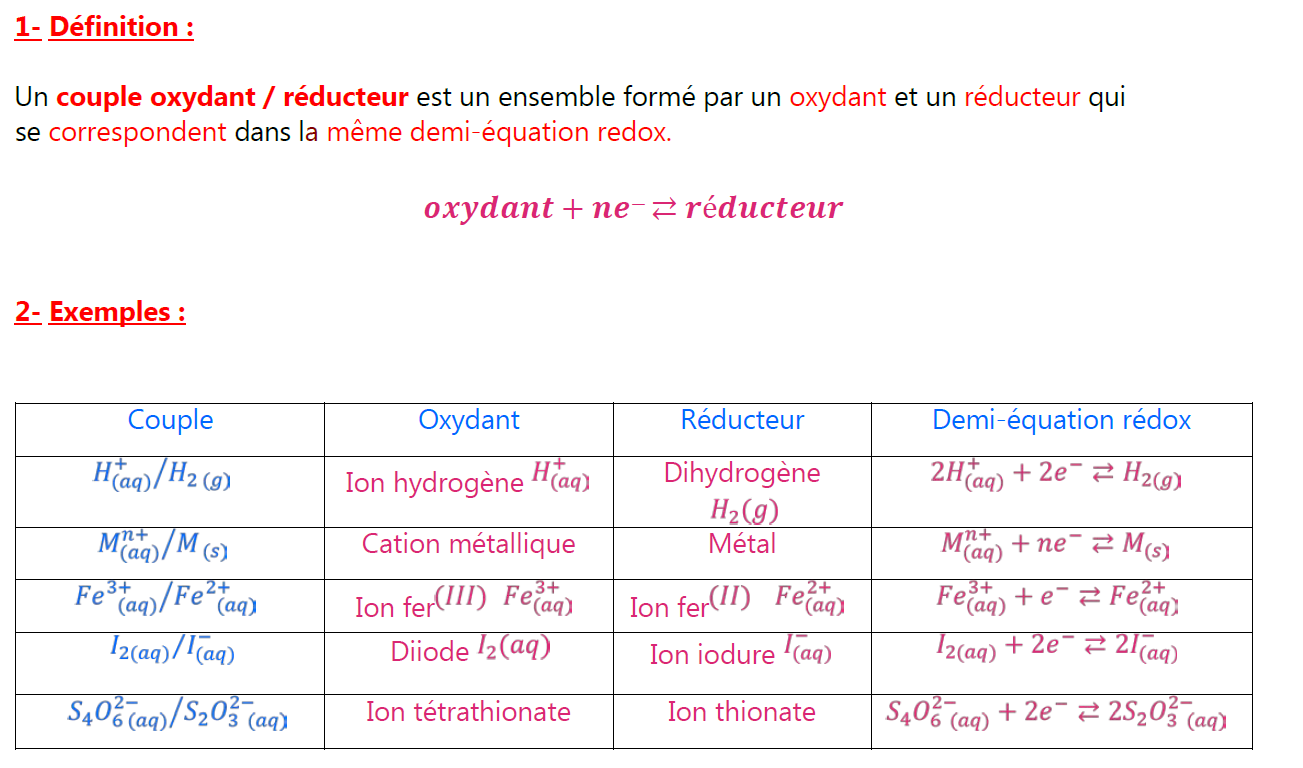 Un couple oxydant / réducteur est un ensemble formé par un oxydant et un réducteur qui se correspondent dans la même demi-équation redox.