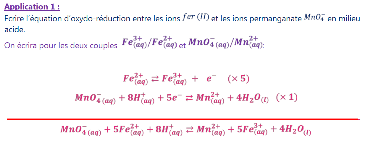 Ecrire l’équation d’oxydo-réduction entre les ions $\mathrm{fer}(I I)$ et les ions permanganate $\mathrm{MnO}_4^{-}$en milieu acide.