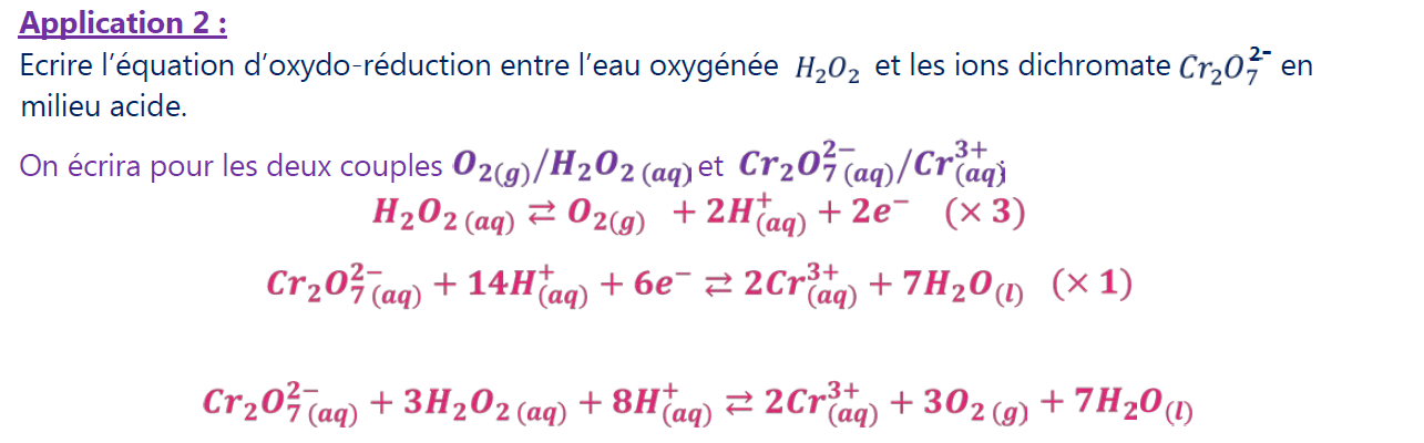 Ecrire l’équation d’oxydo-réduction entre l’eau oxygénée $\mathrm{H}_2 \mathrm{O}_2$ et les ions dichromate $\mathrm{Cr}_2 \mathrm{O}_7^{2-}$ en milieu acide.