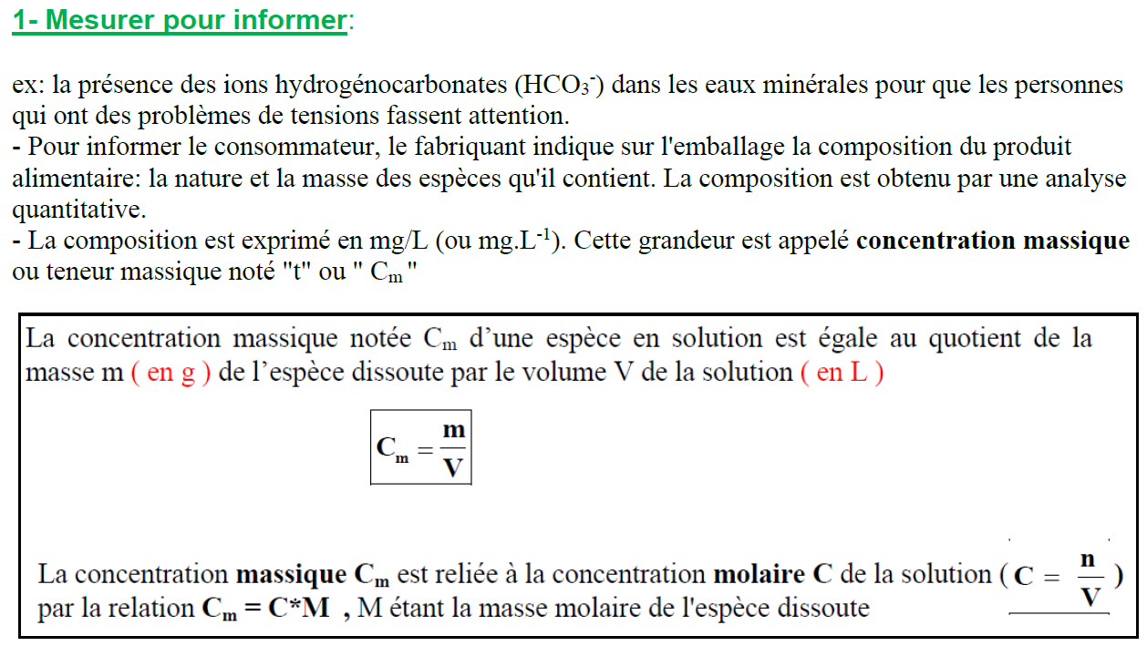– La composition est exprimé en mg/L (ou mg. $\mathrm{L}^{-1}$ ). Cette grandeur est appelé concentration massique ou tencur massique noté “t” ou ” $\mathrm{C}_{\mathrm{m}}$ “