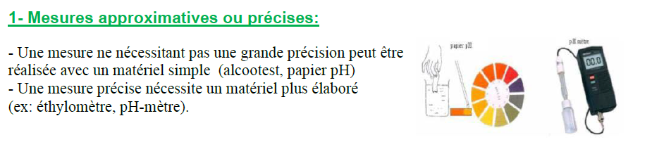 – Une mesure ne nécessitant pas une grande précision peut être réalisée avec un matériel simple (alcootest, papier pH ) – Une mesure précise nécessite un matériel plus élaboré (ex: éthylomètre, pH -mètre).