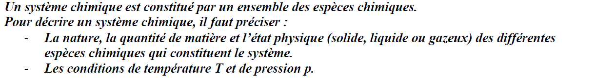 – La nature, la quantité de matière et l’état physique (solide, liquide ou gazeux) des différentes espèces chimiques qui constituent le système.