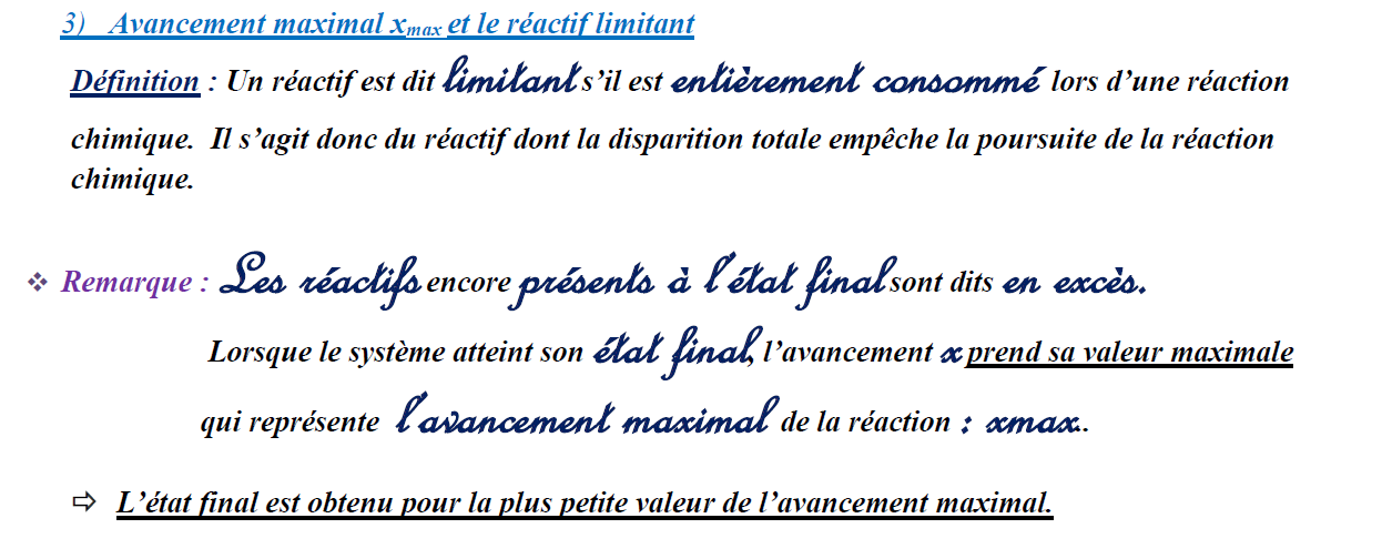 * Remarque : Ses réackifo encore présenté à l’état finalsont dits en excès. Lorsque le système atteint son étal finah, l’avancement \boldsymbol{x} prend sa valeur maximale qui représente lavancement maximal de la réaction : \boldsymbol{x}max.