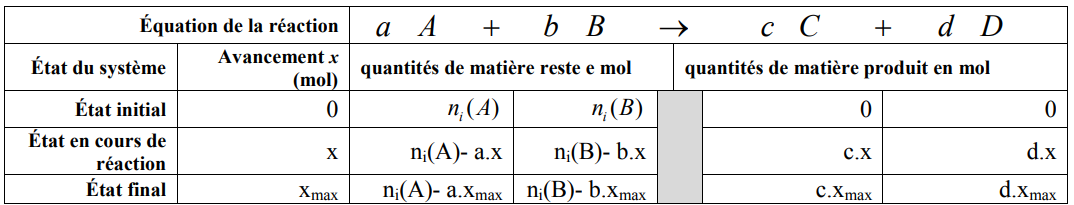 | État en cours de réaction | x | ni(A) – a·x | ni(B) – b·x | c·x | d·x |