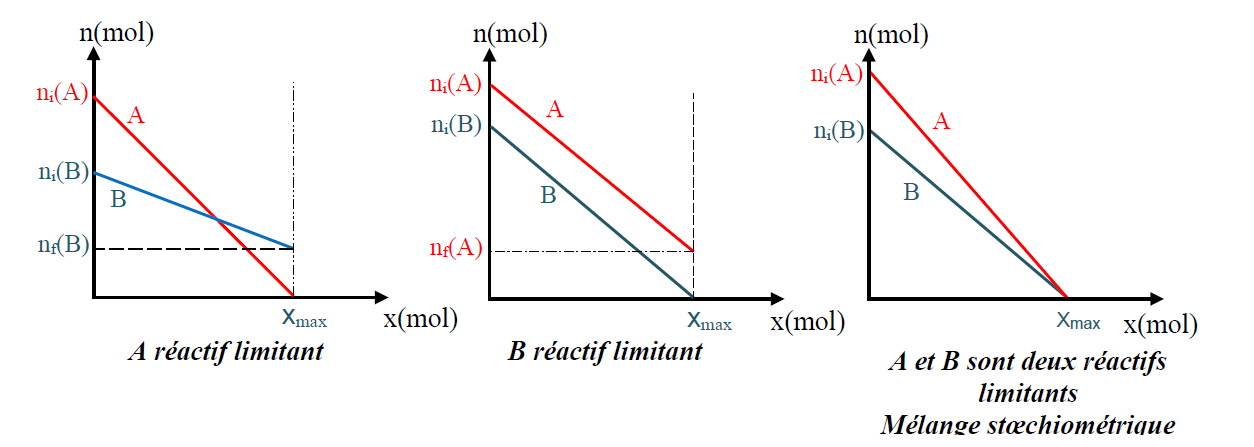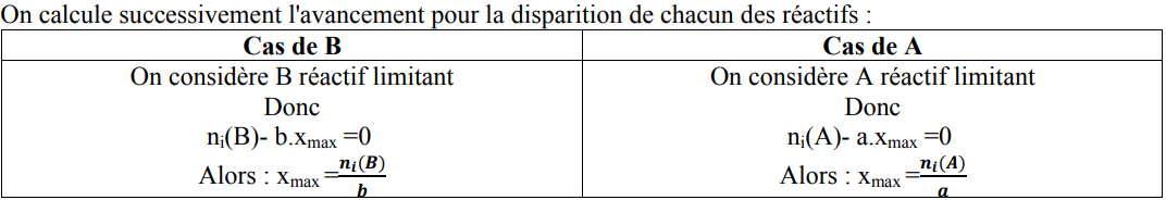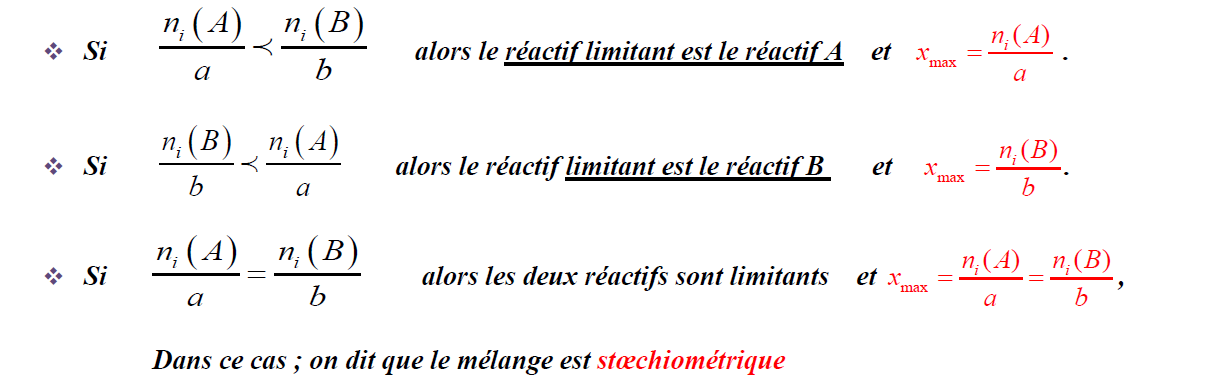 * Si $\quad \frac{n_i(A)}{a} \prec \frac{n_i(B)}{b} \quad$ alors le réactif limitant est le réactif A et $x_{\max }=\frac{n_i(A)}{a}$.