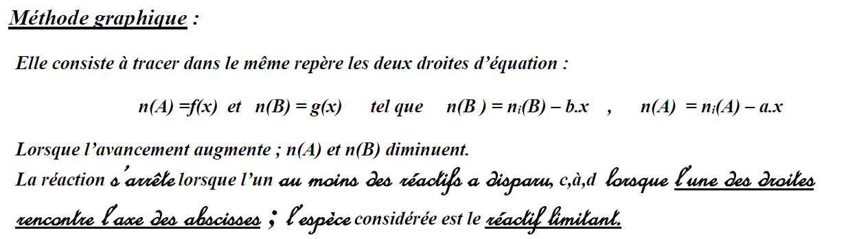 La réaction s’ávête lorsque l’un au moins des véadifo a dispauu, c,à, d lossque lune des droites renconthe laxe des abocisses; leopèce considérée est le réadif limitank.