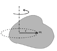 Un corps rigide quelconque tourne autour d’un axe de rotation dont la position et l’orientation restent fixe Le corps est constitué de particules ponctuelles de masse $m_i$ situées à une distance $r_i$ de l’axe de rotation. L’énergie cinétique d’une de ces particules est : $\mathrm{Ec}_{\mathrm{i}}=\frac{1}{2} \cdot m_i, v_i^2$ avec $v_i=r_i . \omega ; \omega$ la vitesse angulaire